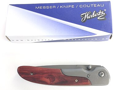 Einhandmesser mit Holzgriffschalen. Rückseitig mit Gürtelclip. Die Klinge wird mittels Linerlock arretiert.