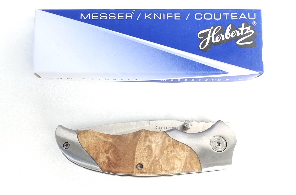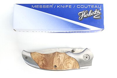 Einhandmesser mit Holzgriffschalen aus Wurzelholz. Rückseitig mit Gürtelclip. Die Klinge wird mittels Linerlock arretiert.