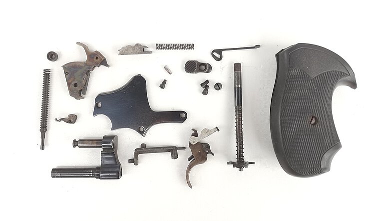 Vollständiges Ersatzteilset für S&W Mod.36 im Kal. .38 Special. Mit dabei ist unter anderem der Hahn mit Schlagbolzen, die Reboundspring inkl. Reboundspring-Gehäuse, der Abzug, die Seitenplatte mit allen drei Schrauben, der Trommelkran, Ausstocher mit Trommelachse, etc.