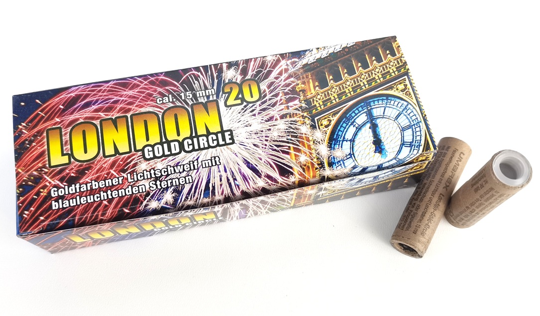 Bei den 15mm London Gold Circle Signalpatronen handelt es sich um zweistufige Raketengeschosse mit einer Steighöhe von unter 100m. Beim Abschuss wird ein goldfarbener Lichtstreif blau leuchtenden Sternen erzeugt.