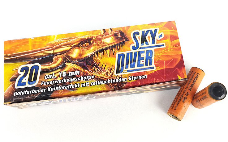 Bei den 15mm Sky Diver Signalpatronen handelt es sich um Multi-Effekte, welche beim Aufsteigen rotblinkende Sterne versprühen und mit einem gold glitzernden Buket detonieren. Die Raketengeschosse untermalen die Leuchteffekte zudem mit verschiedenen Knistereffekte.