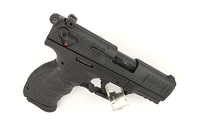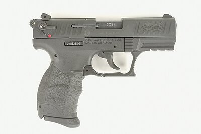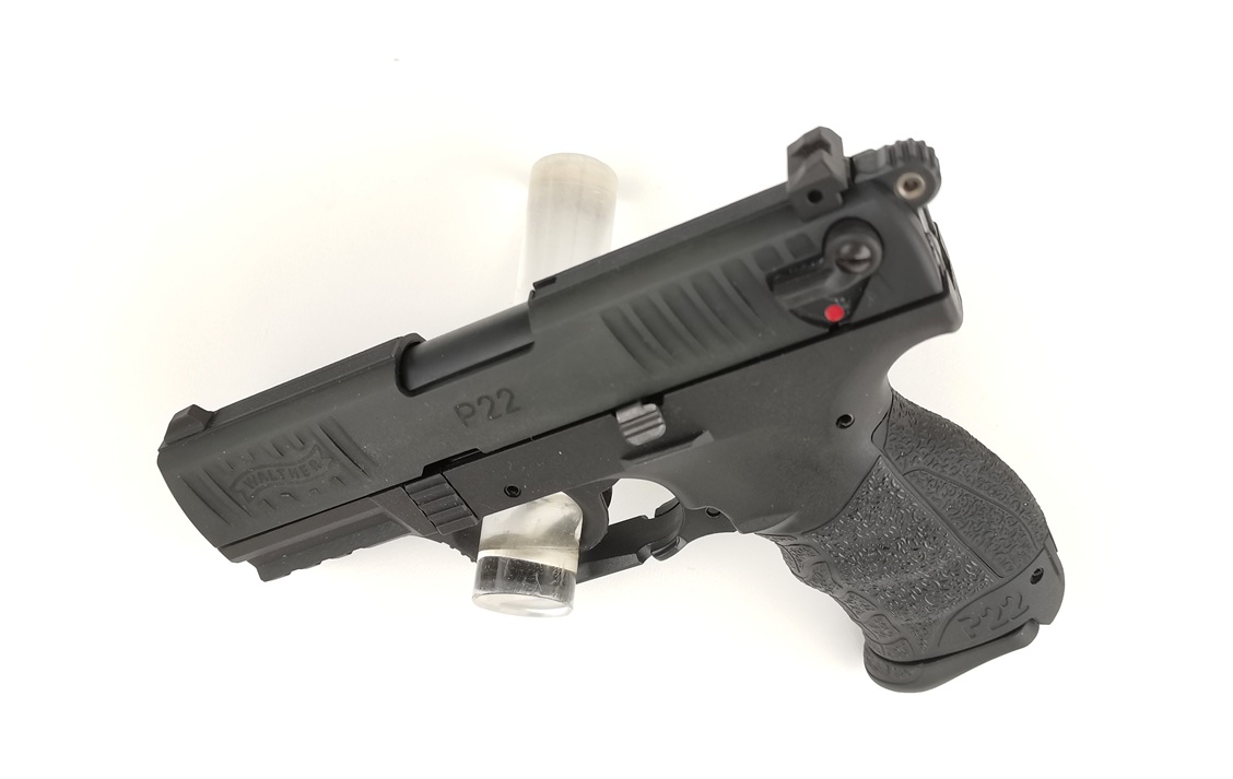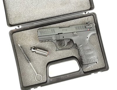 Nachbau der Walther P22Q in solider Qualität. Die Waffe kommt inklusive Abschussbecher und Originalkoffer.