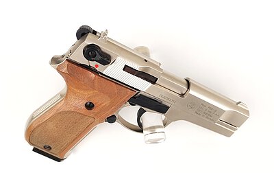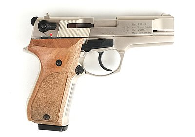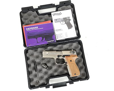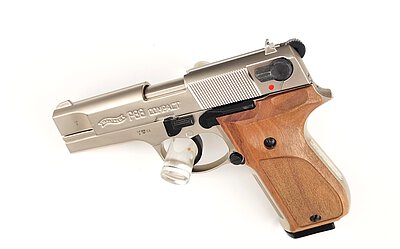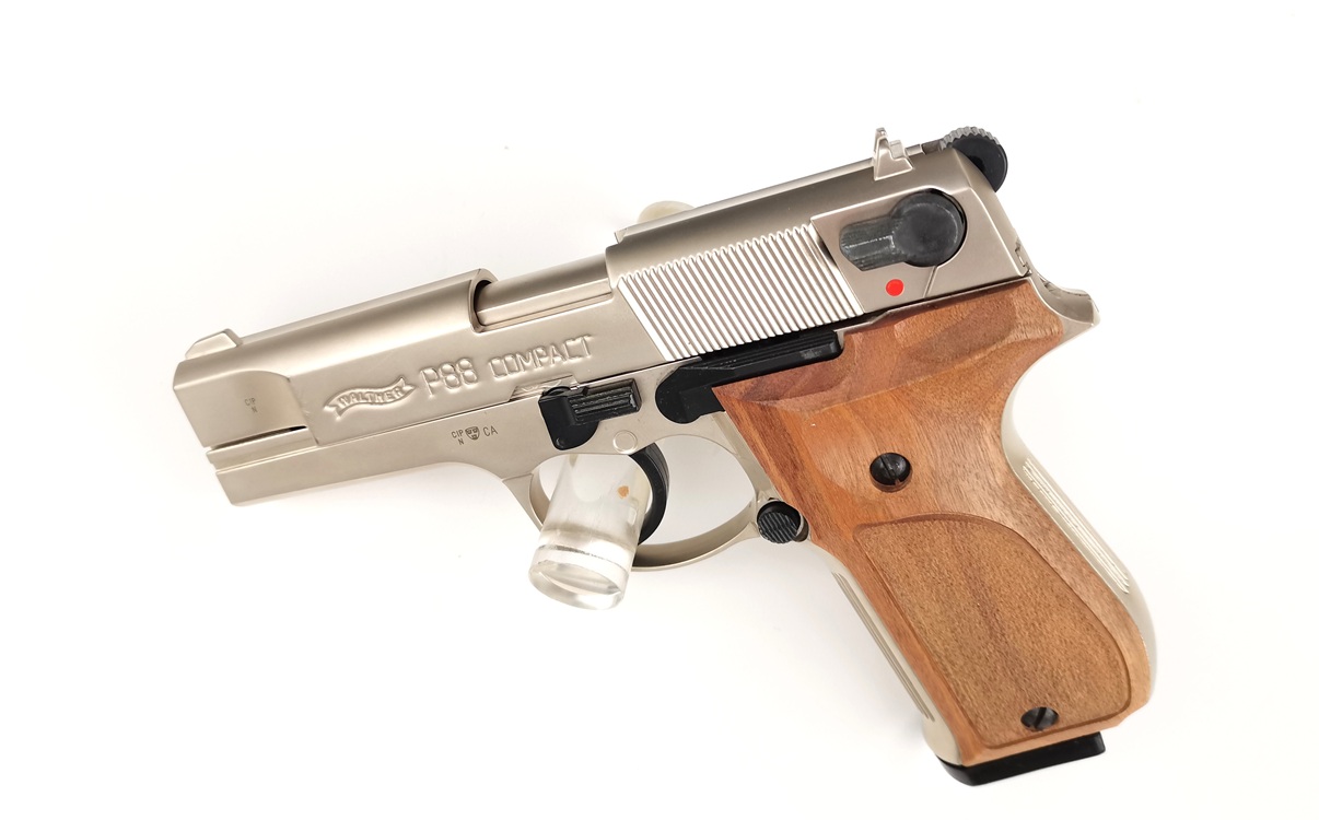 Nachbau der Walther P88 Compact in vernickelter Ausführung mit Echtholzgriffschalen in solider Qualität. Die Waffe kommt inklusive Abschussbecher und Originalkoffer.