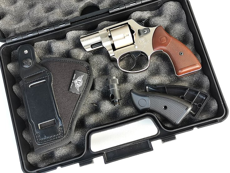 Röhm RG59N "Le Petit" in solider Qualität. Die Waffe kommt inklusive Abschussbecher, Originalkoffer, Holster, sowie mit Ersatzgriffschalen in schwarz.