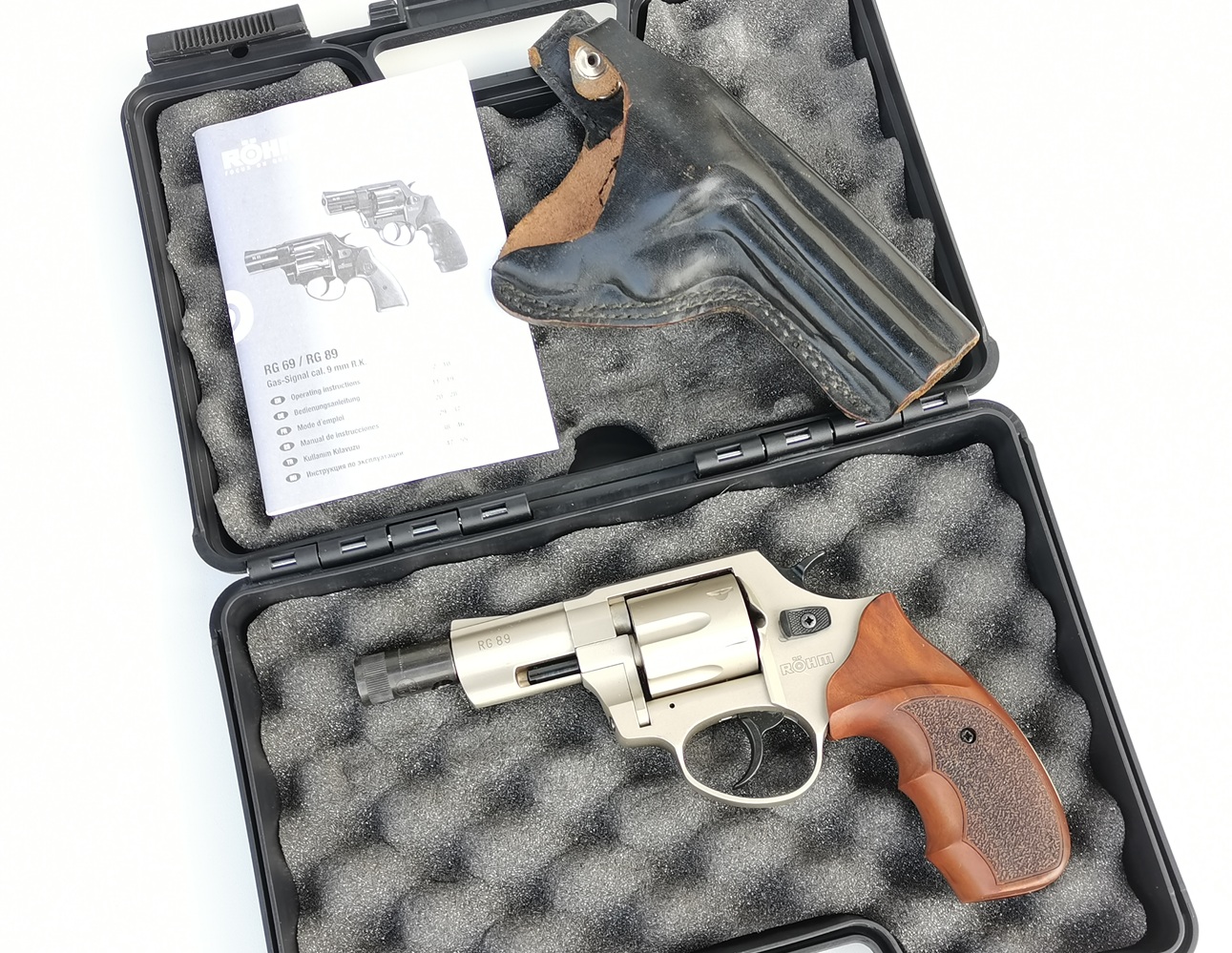 Röhm RG89 Revolver in solider Qualität. Die Waffe besitzt echte Holzgriffschalen und kommt inklusive Abschussbecher, Originalkoffer, sowie Holster.