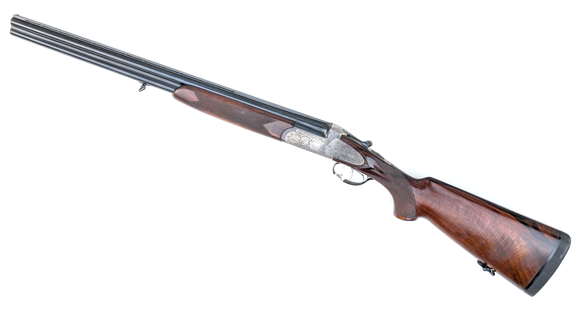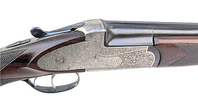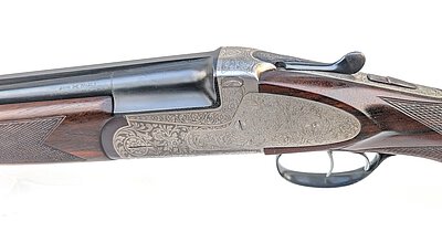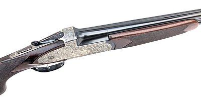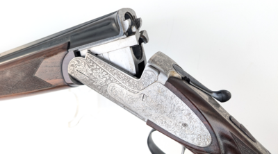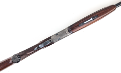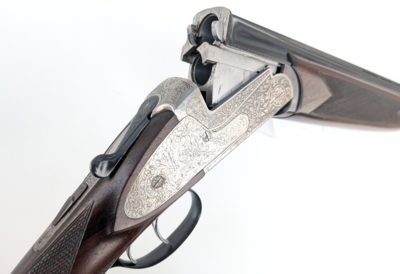 Die Flinte verfügt über eine ventillierte Visierschiene mit Messingkorn, gravierte Basküle mit Zierseitenplatten, Sicherungsschieber auf dem Kolbenhals, Ejektoren, sowie über einen Doppelabzug. Die Läufe sind mit Voll- und Halbchoke versehen. Der Laufzustand ist als neuwertig zu bezeichnen. Preisgünstige und stilvolle Bockdoppelflinte für Jäger und Schützen von großgewachsener Statur.