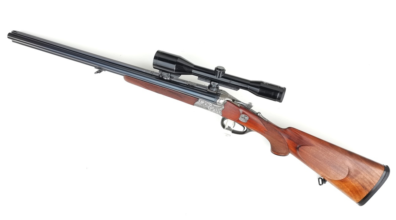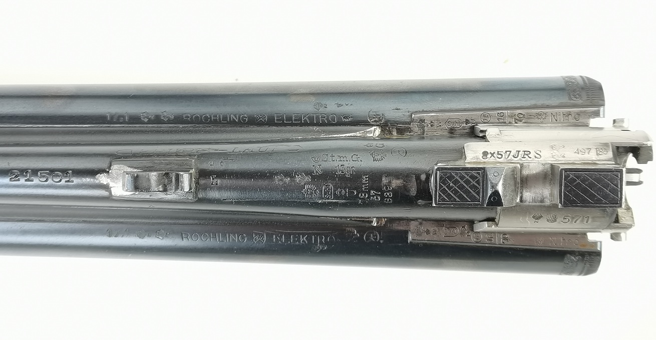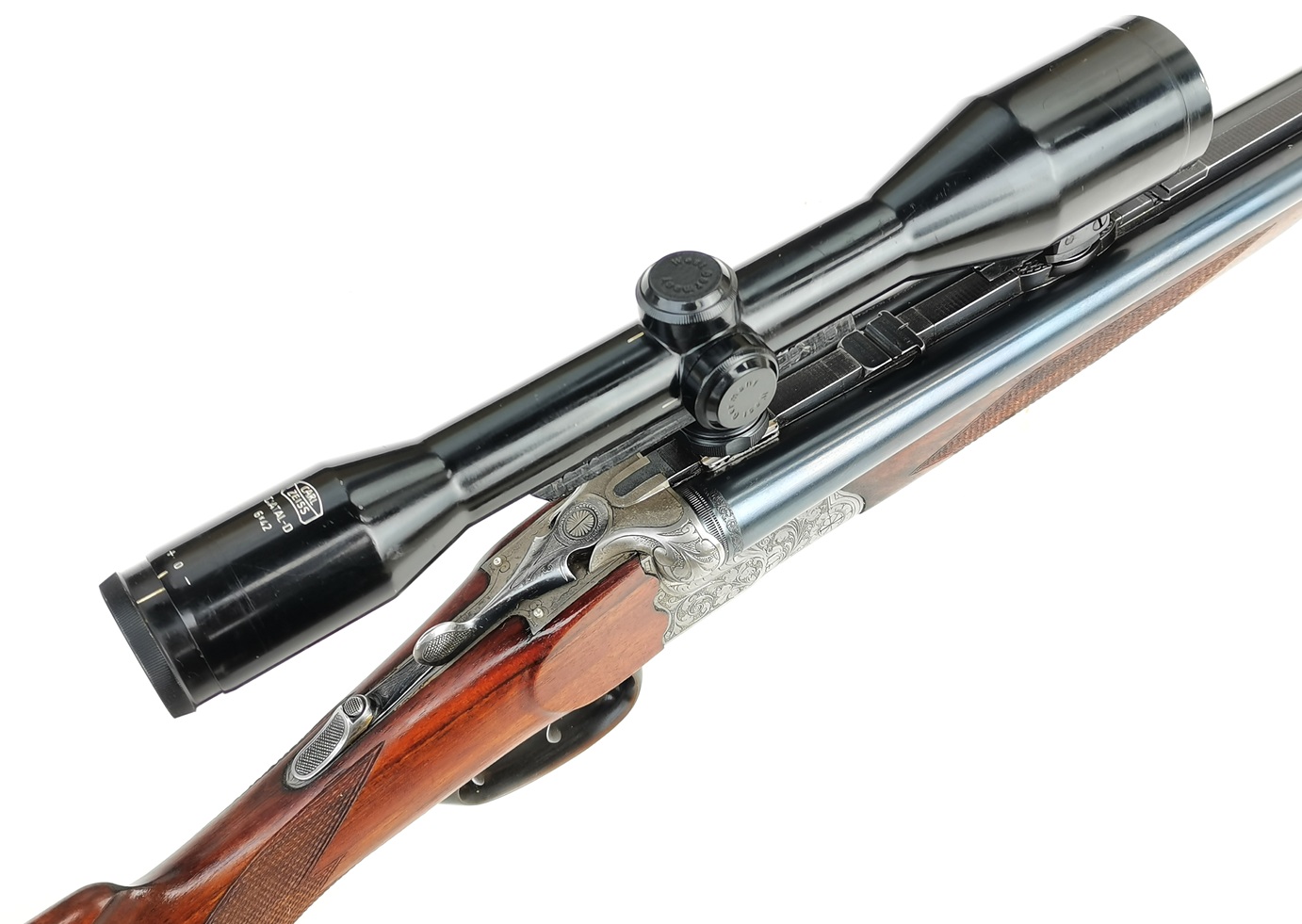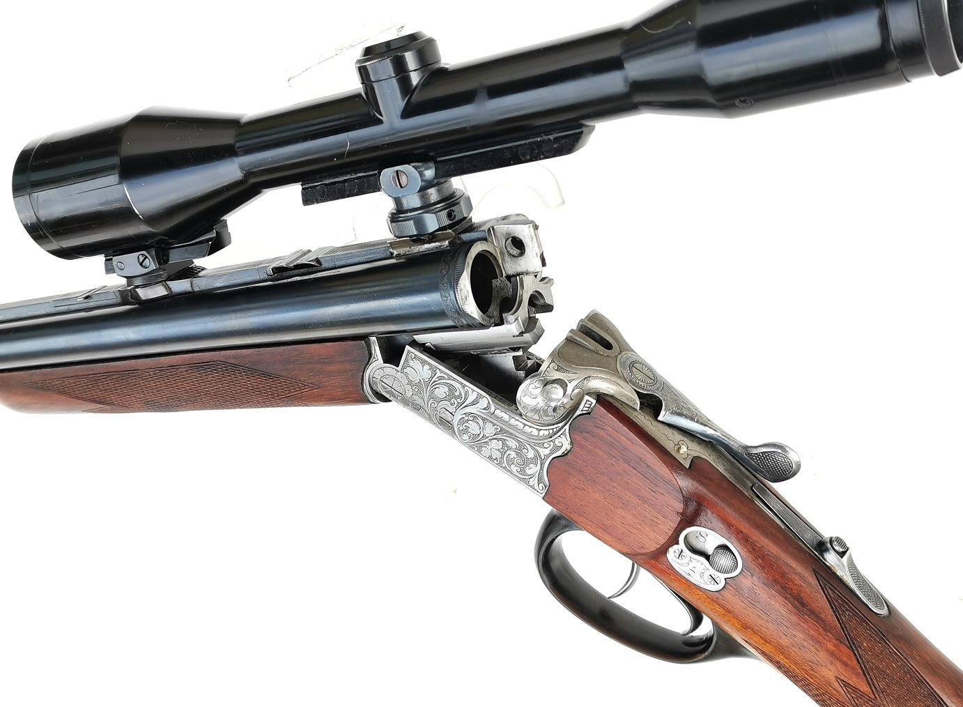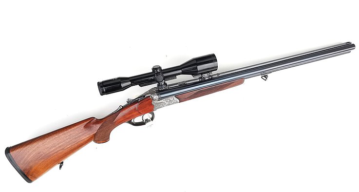 Wunderschöner historischer Drilling aus der renommierten Waffenmanufaktur Sempert & Krieghoff, Suhl. Gefertigt im August 1939, erstmals überarbeitet im Mai 1971 und vollständig überholt im April 1997. Das Laufbündel wurde neu streichbrüniert ohne die Beschriftung zu entfernen, zudem wurde der Drilling neu gedichtet, die Schäftung überarbeitet und der Kugellauf von 8x57JR auf 8x57JRS aufgerieben. Das Patronenlager der Schrotläufe im ehem. Kaliber 16/65 wurde ebenfalls auf 16/70 aufgerieben. Sämtliche Arbeiten wurden höchst professionell ausgeführt und anschließend vom Beschussamt abgenommen. Der Drilling zeichnet sich durch eine separate Kugelspannung mit Signalstiften, seitliche Sicherung, Rückstecher und eine robuste Stahlbasküle aus. Der Abzugsbügel ist aus Horn gefertigt. Der Zustand der Läufe ist ebenfalls einwandfrei. Montiert ist ein Zeiss Diatal-D 6x42 Abs. 8 auf ERA-Schwenkmontage.