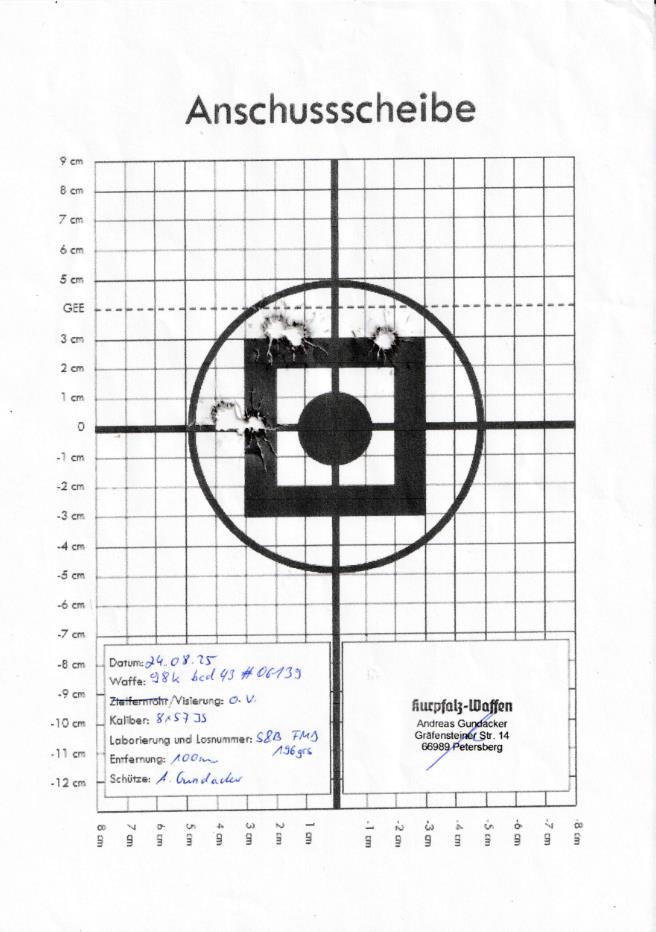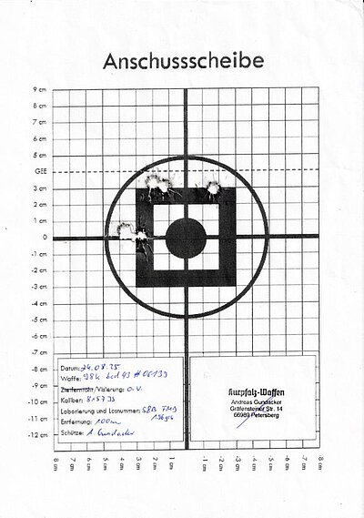 Dieser Karabiner 98k wurde nach 1943 bei den Gustloff-Werken in Weimar für die deutsche Wehrmacht gefertigt und nach 1945 vermutlich für die Polizei / KVP der DDR überholt und befindet sich daher in einwandfreiem Zustand samt neuwertigem Lauf. Viele Teile tragen noch eine WaA-Abnahme. Das Gewehr ist zwar nicht nummerngleich, verfügt jedoch über einen sehr guten Lauf mit ausgezeichneter Präzision, wie die Anschussscheibe zeigt. Der Abzug ist ebenfalls sehr gut und bricht absolut trocken. Mittlerweile selten zu findender Zustand mit gültigem Beschuss. Daher ideal für Sportschützen und Ordonnanzwaffenbegeisterte.