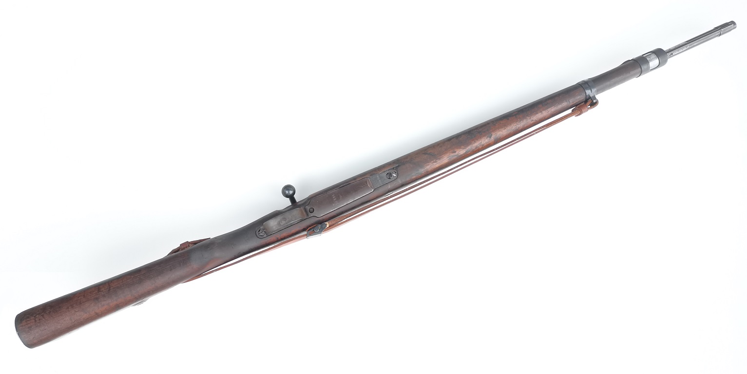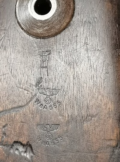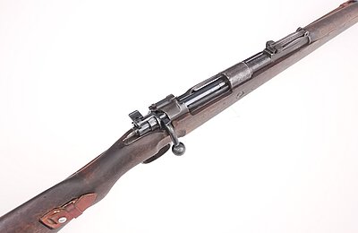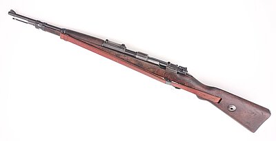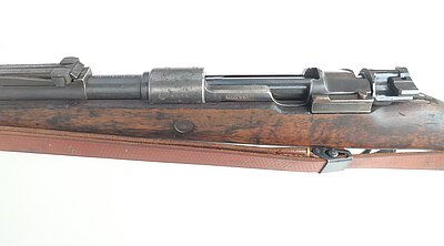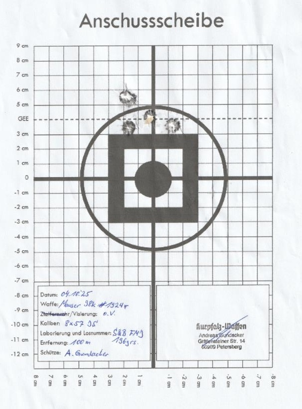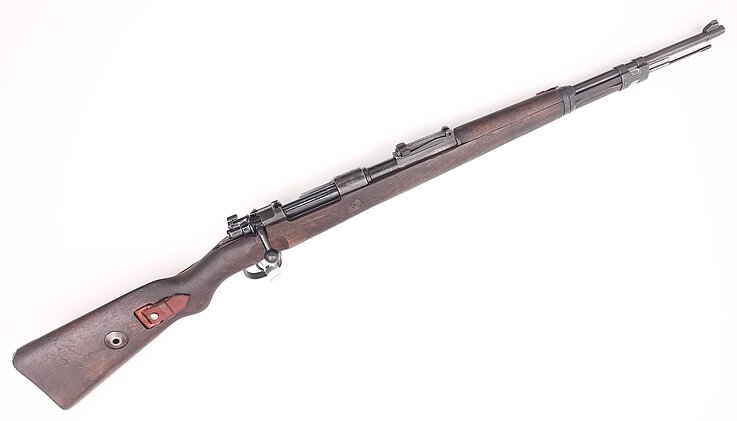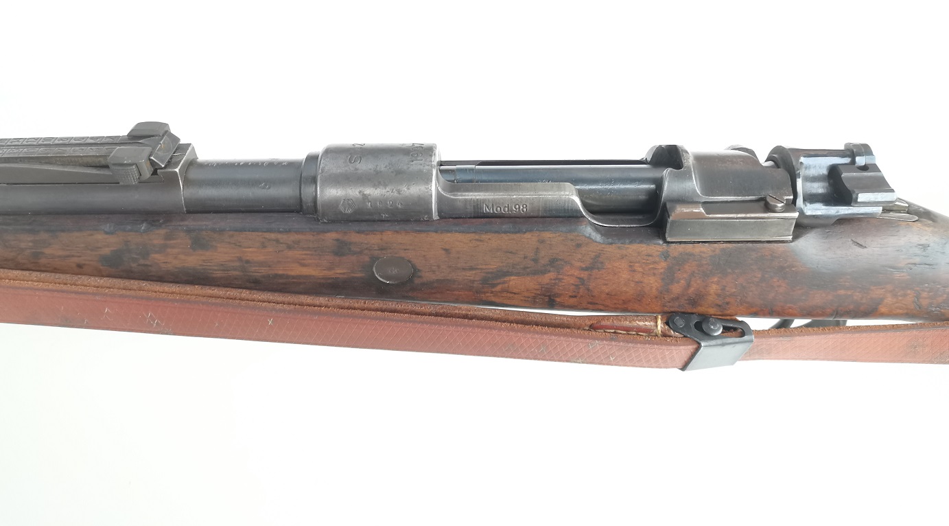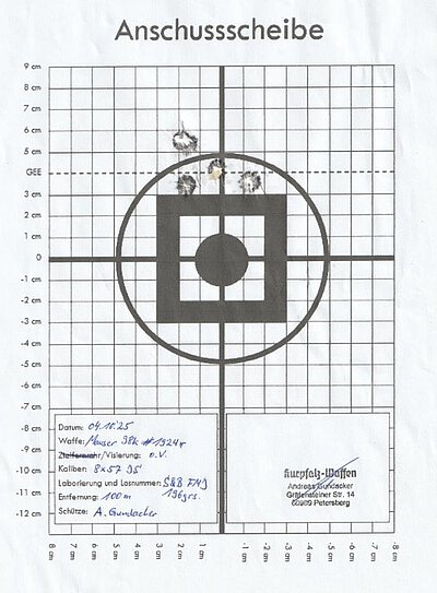 Dieser Karabiner 98k wurde 1937 bei den Mauserwerken für die deutsche Wehrmacht gefertigt. Alle Teile tragen eine WaA-Abnahme. Das Gewehr ist zwar nicht nummerngleich, verfügt jedoch über eine ausgezeichnete Präzision, wie die Anschussscheibe zeigt. Der Abzug ist ebenfalls sehr gut und bricht absolut trocken. Die Waffe besitzt selbstverständlich einen gültigen Beschuss. Daher ideal für Sportschützen und Ordonnanzwaffenbegeisterte. Im Lieferumfang befindet sich noch der abgebildete Lederriemen.