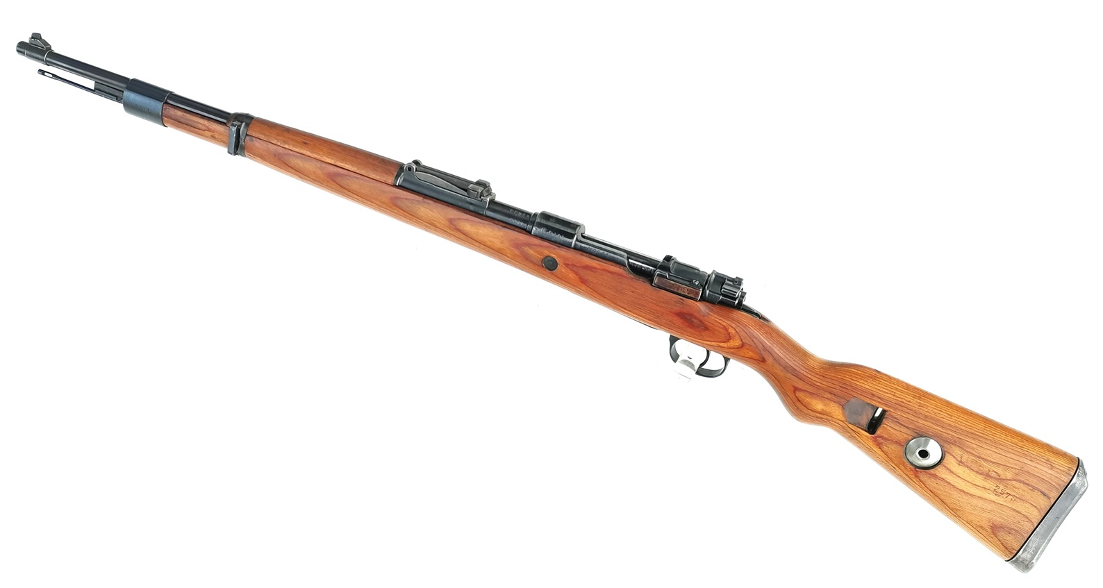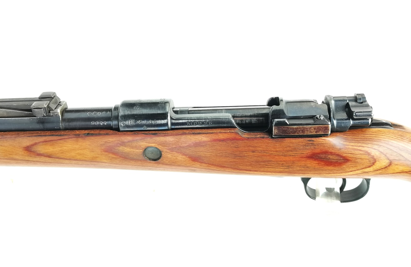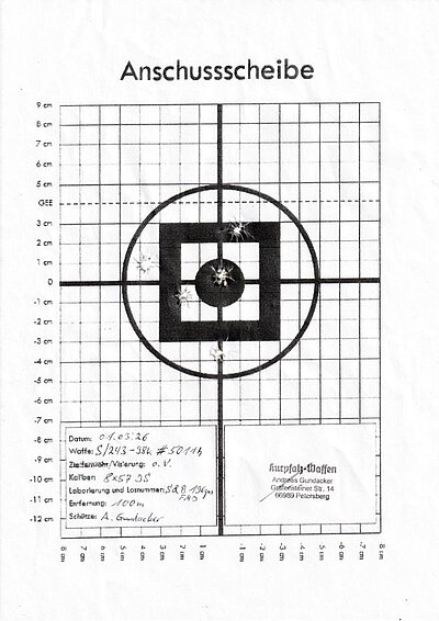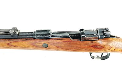 Dieser Karabiner 98k wurde 1937 bei den Mauser-Werken Borsigwalde für die deutsche Wehrmacht gefertigt und nach 1945 vermutlich für die Polizei / KVP der DDR überholt und befindet sich daher in einwandfreiem Zustand samt neuwertigem, spiegelblankem Lauf. Viele Teile tragen noch eine WaA-Abnahme. Das Gewehr ist zwar nicht nummerngleich, verfügt jedoch über einen sehr guten Lauf mit ausgezeichneter Präzision, wie die Anschussscheibe zeigt. Der Abzug ist ebenfalls sehr gut und bricht absolut trocken. Mittlerweile selten zu findender Zustand mit gültigem Beschuss. Daher ideal für Sportschützen und Ordonnanzwaffenbegeisterte.