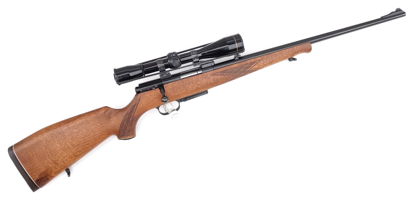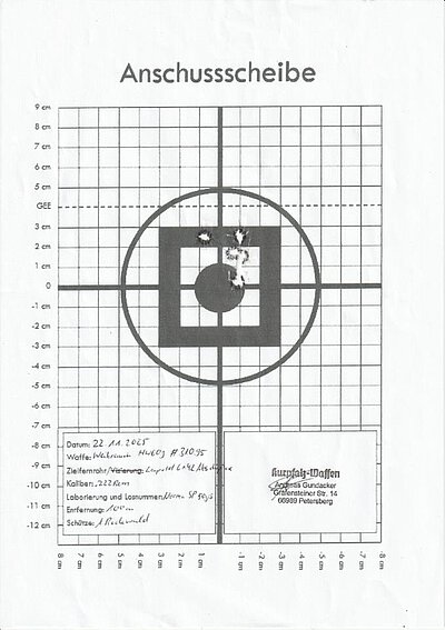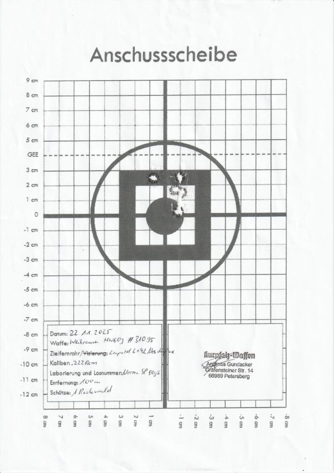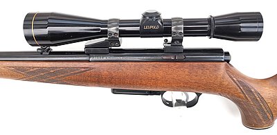Ideale Reh- und Raubwildbüchse. Ebenfalls geeignet zum Schießen der DJV-Disziplinen. Die Büchse verfügt über eine Klappkimme, sowie über EAW-SWM mit montiertem Zielfernrohr Leupold 6x42 Absehen Duplex. Zudem besitzt die Waffe eine seitliche Sicherung und verfügt über einen einstellbaren Feinabzug. Die Präzision mit und ohne Optik auf 100m ist sehr gut, wie die Anschussscheiben zeigen.